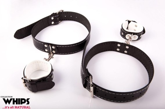 Solidna skórzana uprząż krępująca nadgarstki z udami.