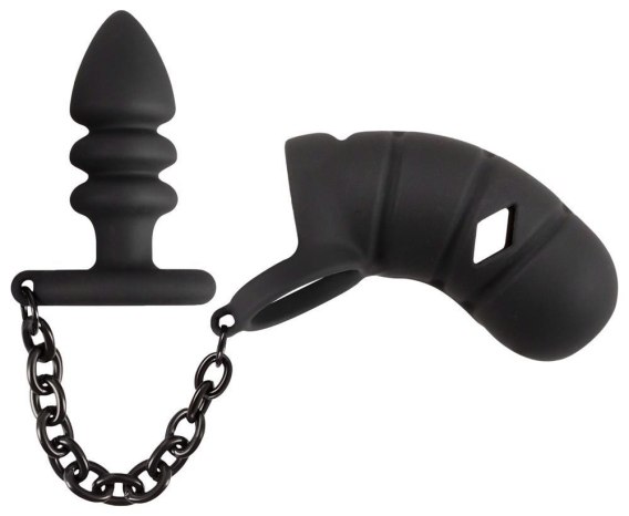 Poznaj Black Velvets Cock Cage with Butt Plug – innowacyjne połączenie klatki na penisa, pierścienia na jądra i korka analnego połączonych solidnym, metalowym łańcuchem.