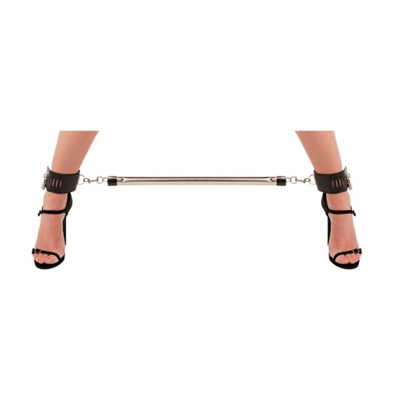 Kajdanki zapewniają stabilne unieruchomienie, a metalowa rozpórka pozwala utrzymać nogi w szerokim rozstawie.
